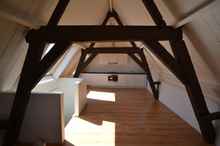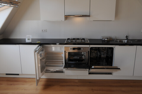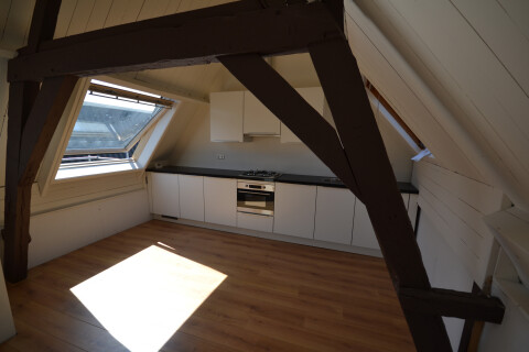 De woning is verdeel over twee verdiepingen. De eerste verdieping ( ca. 24 m2) heeft een grote royale slaapkamer met in de hal de entree naar de (separate) toilet, de douche, de voordeur en de trap naar de tweede verdieping. De tweede verdieping (ca. 32 m2) is een grote zolderruimte, het woongedeelte, met een grootkeukenblok met alles er op en eraan zoals wasmachine, koelkast met vrieskastje, oven/magnetron, afzuiging en veel kastruimte.