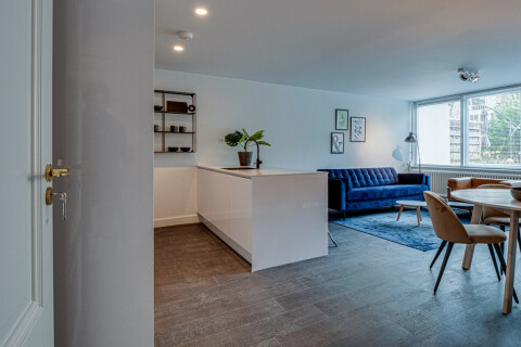 Lichte en ruime woonkamer gelegen aan de tuinzijde. De woning is modern ingericht met luxueus meubelen. Voorzien van een moderne keuken met diverse inbouwapparatuur met alle wenselijke apparatuur. De woonkamer is voorzien van ramen over de gehele breedte.
