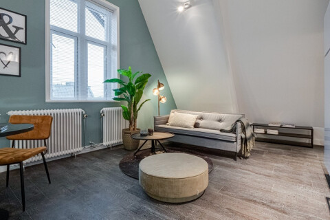 Het appartement is gelegen aan de voorzijde van het pand. Je komt binnen via de hal waar ook de wasmachine is geplaatst. Die geeft toegang tot de ruime woonkamer met open en goed uitgeruste keuken. De woonkamer is voorzien van modern meubilair in de vorm een bank, eettafel & stoelen en een werkplek. De open keuken is van alle gemakken voorzien waaronder een inbouwkoelkast, 4-pits elektrische kookplaat, combi oven, afzuigkap en een vaatwasser. Het appartement heeft een aparte slaapverdieping die je bereikt door middel van de vaste trap vanuit de woonkamer. Deze geeft toegang tot een overloop met een zitje en een slaapgedeelte. In het lichte slaapgedeelte staat een tweepersoonsbed, ladekast en een kledingrek. De frisse badkamer is uitgerust met een inloopdouche, toilet, wastafel en wastafelmeubel.