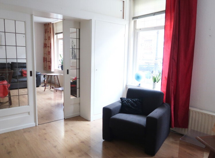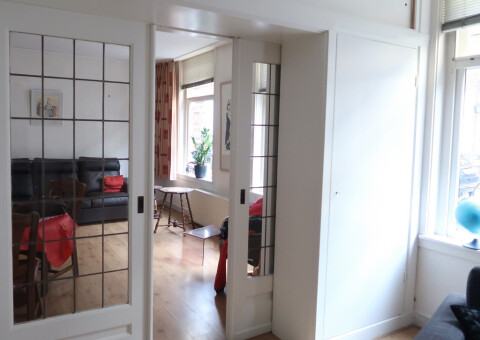 Gang met toegang tot de woonvertrekken, trap naar het souterrain en de badcel met het toilet. Aan de voorzijde van de woning bevinden zich twee ruime kamers, gescheiden door schuifdeuren met glas in loodramen. Eén van de kamers is eventueel als extra slaapkamer of logeerkamer te gebruiken. De andere kamer grenst aan de gedeeltelijk open keuken, voorzien van kookplaat, vaatwasser en koelkast. Via de keuken toegang tot de stadstuin.