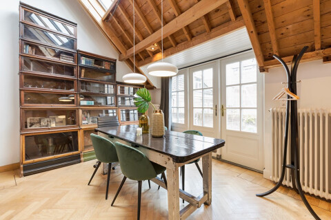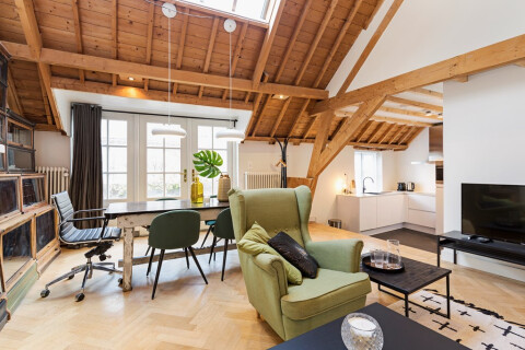 Prachtig appartement gelegen in een monumentaal pand aan de Schoutenstraat. Het appartement is gelegen op de 3e en 4e verdieping in het hart van de binnenstand. Via de entree gaat u naar de 3e verdieping, waar zich de keuken en de badkamer gelegen zijn. De keuken is voorzien van een koelkast, vriezer, combi oven/magnetron, vaatwasser, 4-pits gastoestel en wasmachine. De badkamer is voorzien van een ligbad met douche en wastafel. Op de bovenste verdieping is de ruime woonkamer gelegen welke voorzien is van een authenthieke open haard en kenmerkt zich door het vele hout. Via de woonkamer heeft u toegang tot het zonnige dakterras van ca 35m2 welke is gelegen op het westen. Tevens is er in deze kamer nog een extra ruimte gecreerd die pefect gebruikt kan worden door gasten. Via een trap in het halletje gaat u naar de slaapkamer welke is voorzien is van 2 grote velux ramen en een dubbel bed.