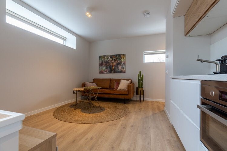 This beautiful 2-room apartment is located on the 1st floor of the building. The living room is fully furnished and the open kitchen is equipped with various built-in appliances (induction hob, fridge-freezer, combi microwave, extractor). From the living area you have access to the bedroom. The bathroom is nicely finished with a walk in shower and modern sink. Washing machine available. To top it off, this apartment has a beautiful PVC floor with underfloor heating. In short, a beautiful apartment on a beautiful location.
