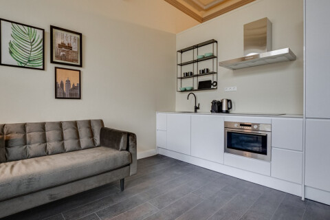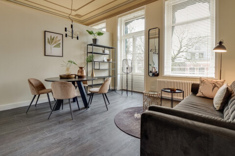 Dit hoogwaardig gerenoveerd appartement is gelegen op 1e verdieping aan de voorzijde van een prachtig monumentaal pand. U komt het appartement binnen in de woonkamer die is v.v. een open keuken met alles benodigde inbouwapparatuur.  Vanuit de woonkamer heeft u middels openslaande deuren toegang tot een balkon. Naast de woonkamer is de slaapkamer gelegen met direct toegang tot de badkamer met douche, wastafel en een toilet. Er is een aparte ruimte met een wasmachine/droger. De gehele woning is volledig gemeubileerd, een houtenvloer en prachtig nieuwe meubels. Op de begane grond aan de voorzijde is nog een gezamenlijke fietsenstalling gelegen.
