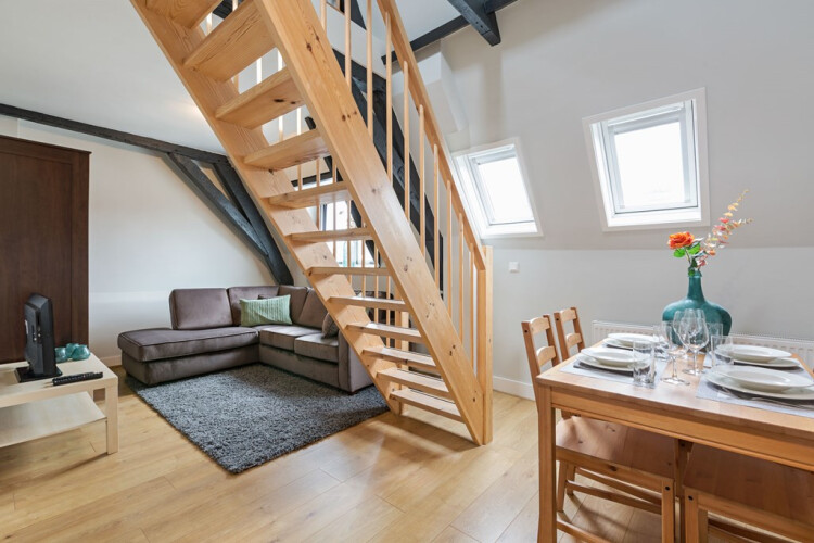 In the middle of Utrecht’s city centre you can find this apartment. The apartment is located on the second floor of this recently stylishly renovated building. The apartment is characterised by the authentic beam structures. You enter the apartment in the living room of approx. 24m2. Here you find the open kitchen, which has been equipped with a dishwasher, oven/microwave and a 4-burner gas stove. Through a staircase in the living room you enter the spacious sleeping loft. At the same floor as the living room you will find the bathroom, which is equipped with a shower, washing machine and sink. There is a separate toilet. In short, a most complete apartment on a top location!