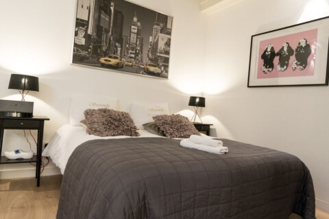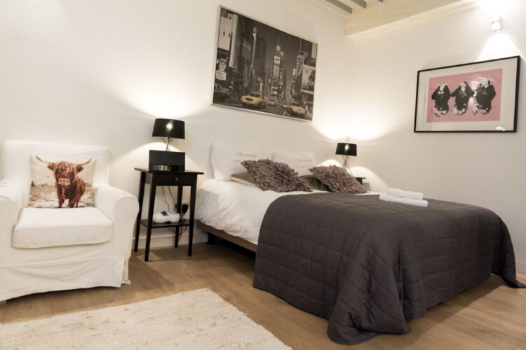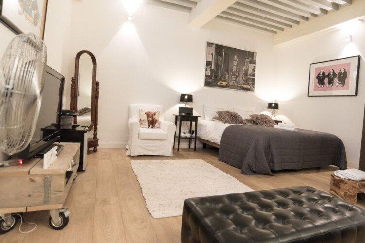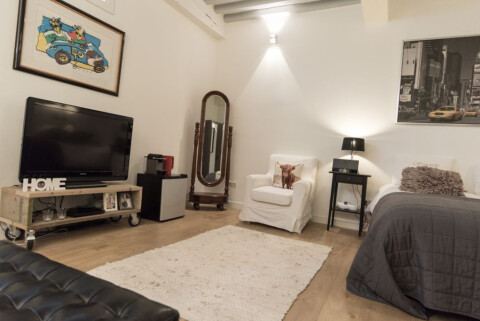 Perfect for a romantic couple seeking a base in the heart of authentic elements, such as the elegant ceiling beams, with a fresh and modern edge, creating a stylish retreat after a busy day. The central space is fitted out with wooden floors, pleasant wall hangings, a sofa, armchair and a double bed with bedside lighting. A flatscreen TV is available for a cosy night in and a high speed Wi-Fi connection is on hand to keep you up to date throughout your stay. The dwelling includes a fridge, kettle and a coffee machine.