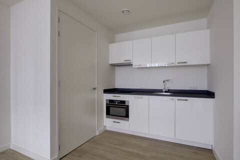 Dit prachtige appartement is gelegen op de 1e verdieping van het pand. Het heeft een ruime woonkamer met open keuken die is v.v. diverse inbouwapparatuur zoals een koelkast, vaatwasser, combi-oven, inductiekookplaat en afzuigkap en een zwart kunststof werkblad.