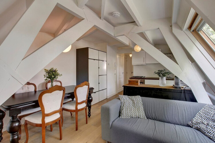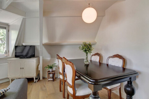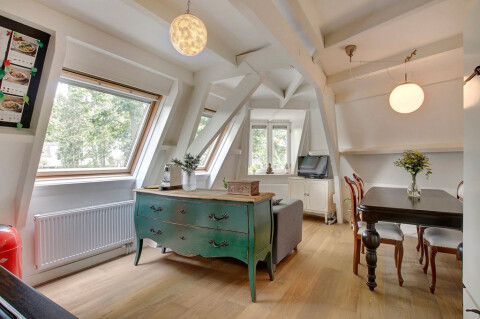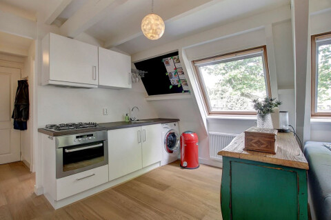 In een prachtig herenhuis op de 2e verdieping is dit hoekappartement gelegen. U komt het appartement binnen in de woonkamer met open keuken die voorzien is van een koelkast, combi oven, 4-pitsfornuis en een wasmachine. Er ligt een eikenhouten lamelparketvloer in de gehele woning. Er is een knusse slaapkamer met op maat gemaakt bed (1.9meter lang). Er is een nette badkamer met douche en wastafel en een separaat toilet. Er is een gezamenlijk dakterras aanwezig waar de gehele dag zon is.