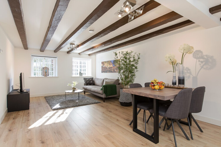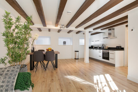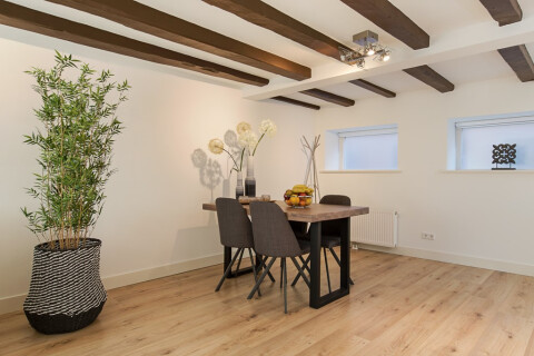 This aparment is situated on the first floor and offers a modern interior that includes a dining area, comfy sofa, a brand new fully equipped kitchen, a bathroom, a separate toilet and a nice view from the apartment at the front side of the building, and a communal garden has been added to the apartment on the rearside of the building. Combine the cozy interior with the location in a quiet former monastery garden.