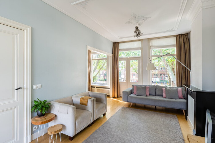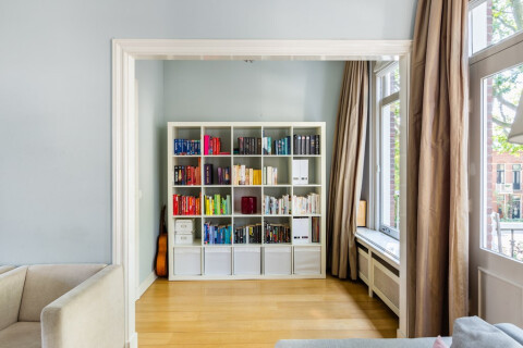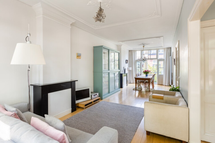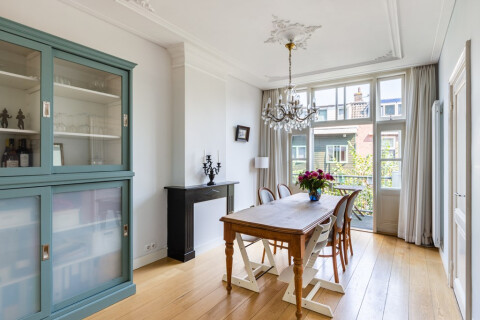 Deze prachtig lichte bovenwoning is gelegen op de 1e en 2e verdieping. Op de 1e verdieping bevindt zich de ruime woonkamer van ca. 30m2 met aan de achterzijde openslaande deuren naar een ruim balkon. De woonkamer kenmerkt zicht door prachtige ornamenten op het plafond, aan de voorzijde is ook nog een klein balkon gelegen met openslaande deuren. Op deze verdieping is ook de gesloten keuken gelegen die is v.v. alle benodigde inbouwapparatuur. Op de hal bevindt zich nog een aparte berging. Op de 2e verdieping bevinden zich 3 slaapkamers. Waarvan 2 ruime slaapkamers en een kleine slaap, werk of studeerkamer. De badkamer is v.v. een bad, douche, wastafel, toilet en wasmachine/droger aansluiting. Kortom een prachtige woning in een zeer geliefde buurt!