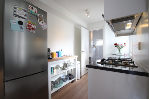 Het appartement heeft een gedeelde entree welke word gedeeld met twee andere appartementen. Via de trap gaat u naar de 1e verdieping waar de entree van het appartement zich bevindt. U komt binnen in de ruime woonkamer van ca. 32m2 welke is voorzien van een nieuwe laminaatvloer en een open keuken. De open keuken is v.v. een koelkast met vriesvak, combi oven/magnetron, vaatwasser en een 4-pits gasfornuis. Het slaapgedeelte van ca. 14 m2 ligt aan de voorzijde van het appartement en is middels paneel gordijnen af te sluiten. Daarbij is er een badkamer met douche, wastafel en toilet. In de keuken is een wasmachine aanwezig.