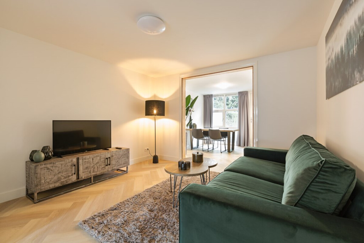 This beautiful furnished 3-room apartment is located in the basement of this beautiful building. Upon entering you will have access to a spacious living room in the back of the apartment. From the living room you can reach the large garden (approx. 30m²) that faces east. Next to the living room the half open, L-shaped kitchen is situated, which is provided with all the necessary equipment, such as a dishwasher, fridge, over, stove and extraction hood. In the front you will find the spacious bedroom with, next to it, a second, smaller bed- or working room. In the middle of the apartment the bathroom is positioned. Here you will find a shower, double sink and a toilet. In addition, there is a second toilet and a separate room with a washing machine/tumble dryer combination. In short, a beautiful new apartment in a quiet location.