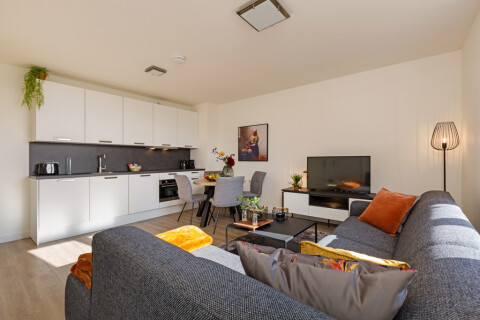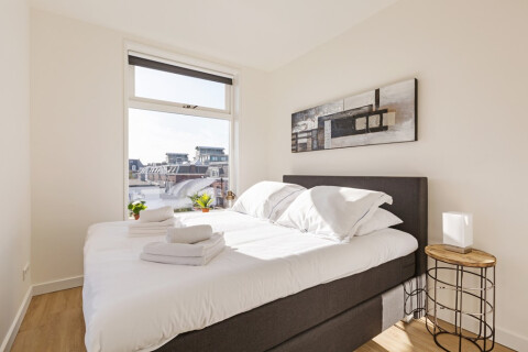 This apartment is located on the third floor at the back. The apartment has a modern interior with comfy sofa, brand new kitchen with luxury equipment, a bedroom with a double bed, large bathroom that offer a shower, washing basin, toilet and towel heating. This apartment is also equipped with a nice roofterrace