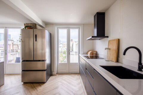 Stairwell to the second floor. The landing provides access to the hall with another separate toilet. The toilet has a fountain. From the hall you enter the modern kitchen. The kitchen (renewed in 2023) is of high quality and is equipped with all desirable built-in appliances such as a spacious oven, microwave, electric hob, extractor hood, fridge, freezer and sink with thermostatic mixer tap. The kitchen has a pleasant connection with the living room. Ideal for a cooking enthusiast. Access to the terrace from the living room and kitchen. This offers a unique view of the city. Access to the bedroom from the living room. The bedroom is spacious and has a pleasant light. The bathroom can be reached from the bedroom. This is equipped with a rain shower, sink with drawer furniture and the connections for the washing machine and dryer.