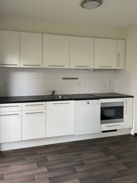 Ruime lichte woonkamer van ca 35m². Keuken is voorzien van een 4 pist inductie kookplaat, afzuigkap, combi magnetron en een vaatwasser. Via de woonkamer heeft u toegang tot de ruime tuin (NO) met schuur en achterom.