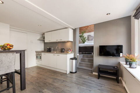 The apartment can be found at the first floor of the building. The apartment has got a warm and contemporary interior, a new kitchen, a spacious lounge and dining area. In addition, a large bedroom with double bed is situated next to the living area. Attached to the bedroom, the brand new bathroom offers all the comfort required with a shower, toilet, washbasin and washing/drying combination. Ultimately, a storage loft will provide all the extra space necessary to put away belongings not essential for daily live.