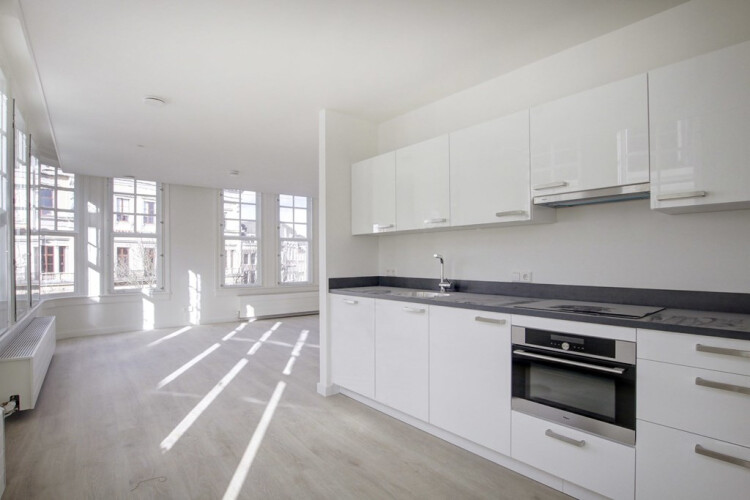 De royale woonkamer is gelegen aan de voorzijde van het appartement, die zich kenmerkt door veel lichtinval, en met een schitterend uitzicht over de Oudegracht. De woonkamer met een moderne open keuken welke is v.v. diverse Pelgrim inbouwapparatuur: te weten koel- /vriescombinatie, vaatwasser, combi-oven, inductiekookplaat en afzuigkap.