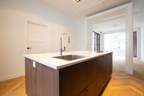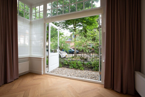 Dit prachtig hoogwaardig afgewerkte appartement is gelegen op de begane grond en kenmerkt zich door hoge plafonds. Aan de voorzijde is de ruime woonkamer gelegen middels openslaande deuren heeft u toegang tot de tuin aan de voorzijde. In de woonkamer kan gekozen worden om d.m.v van een glaswand een 2e slaap/studeerkamer te realiseren. In het midden is keuken gelegen met groot kookeiland die tevens is v.v. van alle benodigde inbouwapparatuur. Aan de achterzijde bevindt zich de badkamer met douche en toilet. Middels openslaande deuren heeft u toegang tot de ruime tuin aan de achterzijde. Vanuit zowel de woonkamer als de badkamer is de ruime slaapkamer te bereiken. In de kelder van het pand is nog een separate berging gelegen en bij de entree is een gezamenlijke mogelijkheid tot het stallen van je fiets.