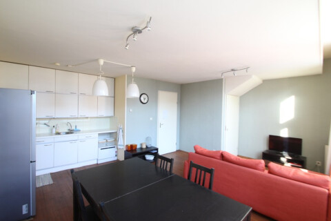 This spacious 3-room apartment is located on the 1st floor of the building. When entering the apartment , you will find yourself in the hall where you will have access to the large living room of approximately 30m2 on the back side of the building. Here you can find the open kitchen, which is equipped with a fridge, oven, stove and hood. Through patio doors you will have access to a spacious roof terrace of approximately 22m2. This roof terrace faces east.
