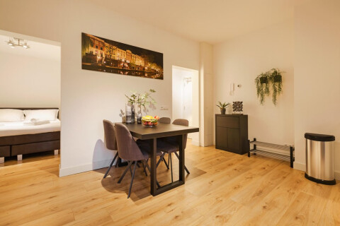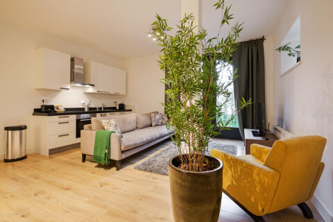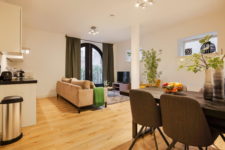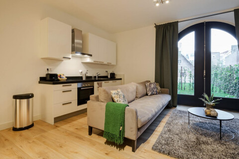 This apartment offers a modern interior that includes a dining area, comfy sofa, a fully equipped kitchen, a bathroom, a separate toilet, one bedroom with a double bed, a nice view from the apartment at the front side of the building, and a communal garden has been added to the apartment on the rear side of the building. Combine the cosy interior with the location in a quiet former monastery garden, in the heart of the city yet away from the daily fuzz of the city.