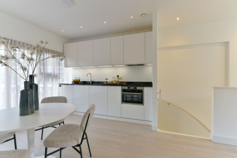 De eerste verdieping biedt een prachtige open woonruimte met veel lichtinval. Aan de achterzijde bevindt zich de stijlvolle woonkeuken, uitgerust met een modern keukenblok en hoogwaardige inbouwapparatuur. De woonkamer aan de voorzijde wordt gekenmerkt door een industriële glazen pui die leidt naar het zonnige balkon op het zuiden.