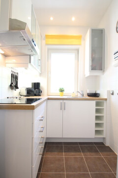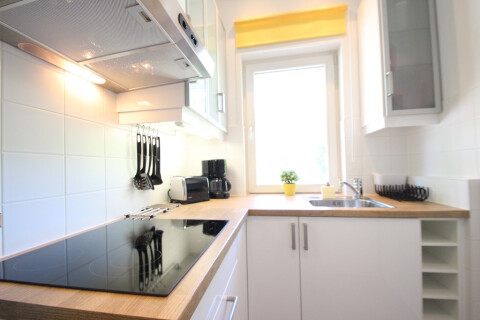 The apartment features a practical and comfortable living room which will make you feel at home in no time. HD television and fast internet (WiFi and cabled) are at your service. A complete and fully equipped kitchen. There is nice bedroom with plenty of space for your clothing, shoes, etc. in the various closets you’ll find additional storage for household items in the built in closet. This beautiful, functional and storage-friendly bathroom is just what you need. Plenty of space for towels, bathroom linens and toiletries in the large closet. Store your cosmetics in the mirrored cabinet. There’s even more storage in the basin drawers.