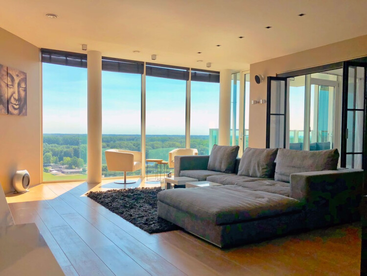 Stylish furnished 3-room (2 bedrooms, 1 bathroom) apartment. The apartment is on the 14th floor of Utrecht's most impressive residential tower and has a private balcony and breathtaking view over the skyline of Utrecht from the hall, the sports fields and wooded area from the living room. The apartment is equipped with the IRS system (Integrated Residential Services) with a range of services that makes daily life easier, safer and more comfortable. For example, contact with domestic service, dry cleaning service and any messages or personal alarm. This apartments featues a large livingroom with open kitchen which is equipped with all the necassery equipment. The apartments features a large master bedroom and a separate guest/studyroom. The apartment also has a balcony.