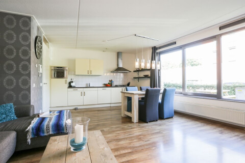 Dit modern goed onderhouden hoek-appartement is gelegen op de begane grond. Het appartement beschikt over een ruime en lichte woonkamer met een open keuken die is voorzien van een koelkast, vaatwasser, combimagnetron, gasfornuis en afzuigkap. Het appartement heeft een ruime slaapkamer met ingebouwde kledingkast. De badkamer is voorzien van een douche, wastafel, toilet en heeft en wasmachine/droger aansluiting. Er is een separaat toilet. Het appartementencomplex heeft aan de voorzijde een stukje tuin met picknick bank waar drie appartementen gebruik van maken en gezellig borrelen in de zon voor het huis. Via de elektrische toegangsdeur naast het huis krijg je toegang tot een eigen berging voor fietsen en/of opslag.
