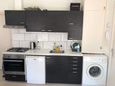 Het appartement is gelegen op de 1e verdieping en u komt het appartement binnen direct in de woonkamer die zich kenmerkt door veel lichtinval. De woonkamer heeft een open keuken die is voorzien van een vier-pits gaskookplaat, oven en wasmachineaansluiting. Daarnaast is de slaapkamer gelegen. Die tevens geeft tot een klein balkon waar u heerlijk kunt genieten van de zon. De badkamer is v.v. een douche, wastafel en toilet.