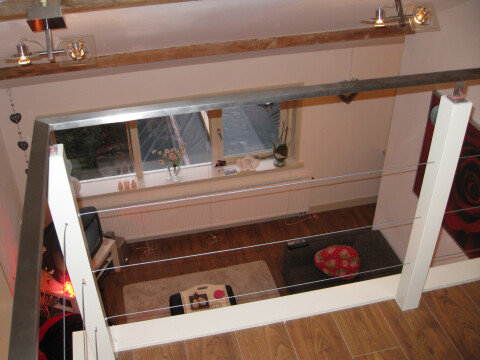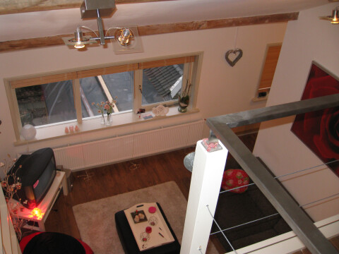 Bestaat uit woonkamer (20m2), vide met trap naar slaapkamer (14m2 met veel bergruimte) en eigen keuken, douche/WC (8m2).