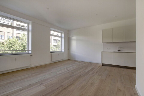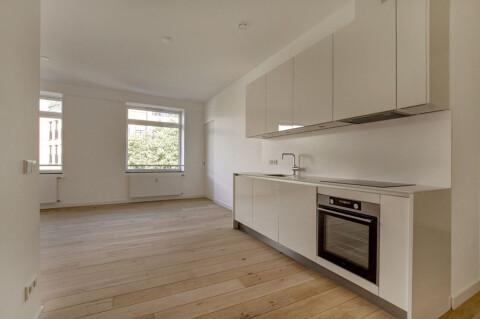Dit prachtige 2-kamer appartement is gelegen op de 3e verdieping van een volledig gerenoveerd pand in 2016. Via de entreehal heeft u toegang tot de ruime woonkamer die zich kenmerkt door veel lichtinval. De woonkamer heeft een open keuken die is v.v. een inductiekookplaat, vaatwasser, combi/magnetron en koelkast.